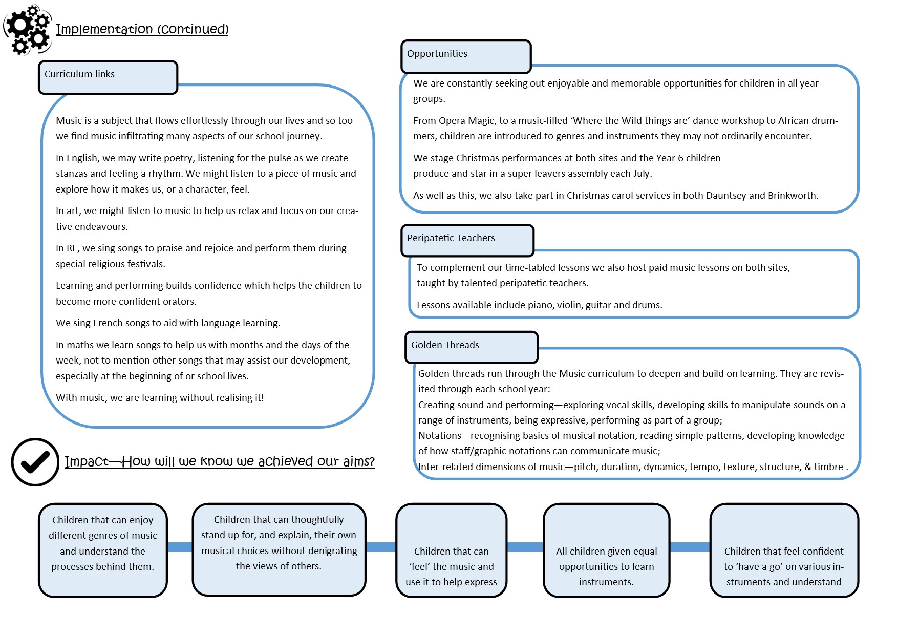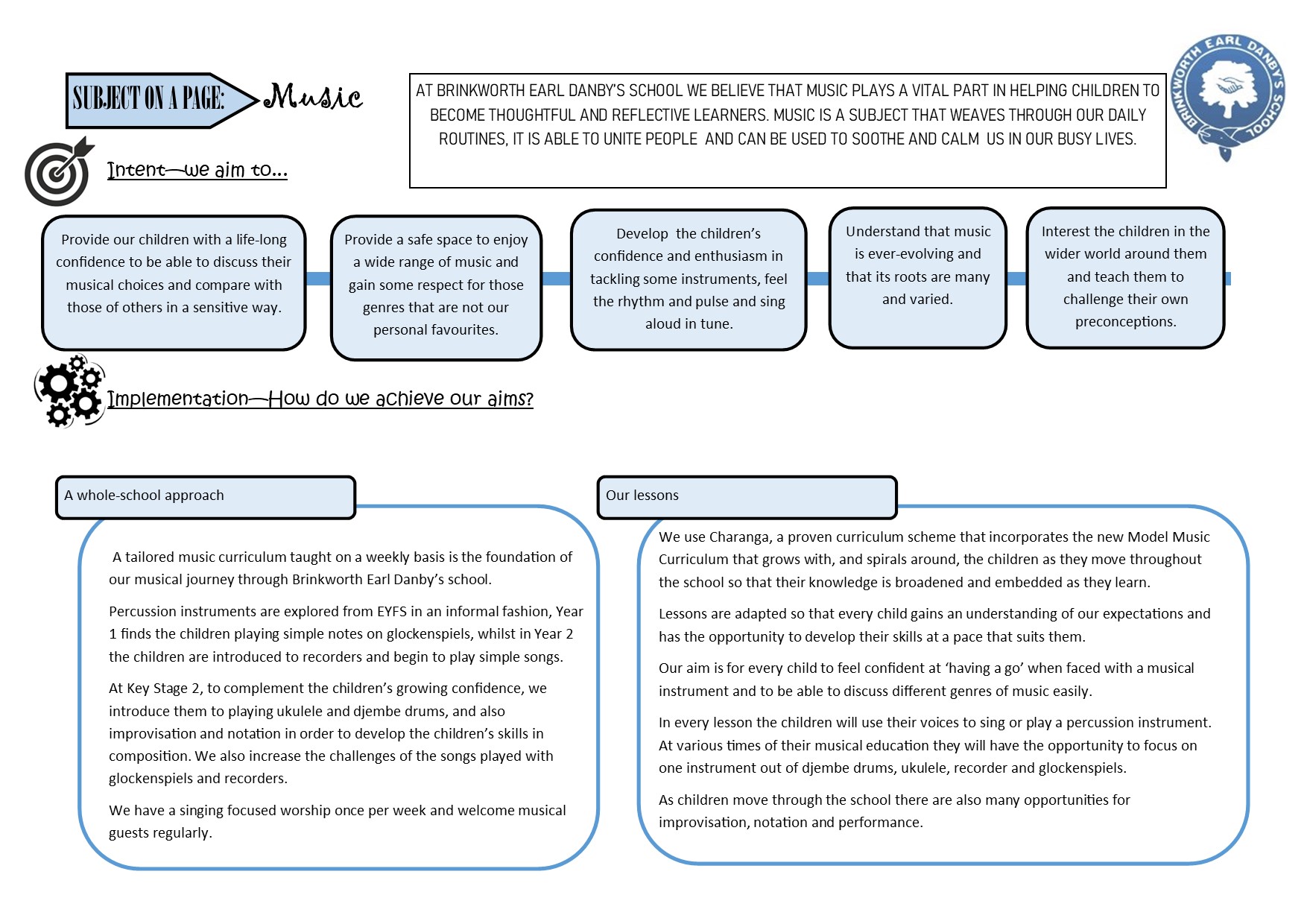 | Mission Sentence | At Brinkworth Earl Danby's School we believe that music plays a vital part in helping children to become thoughtful and reflective learners. Music is a subject that weaves through our daily routines, it is able to unite people and can be used to soothe and calm us in our busy lives. |