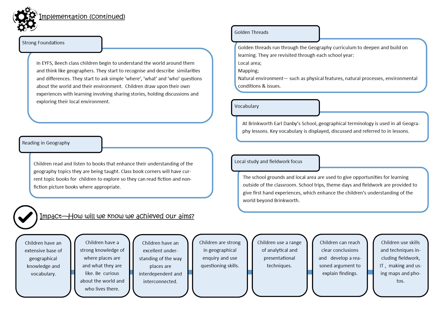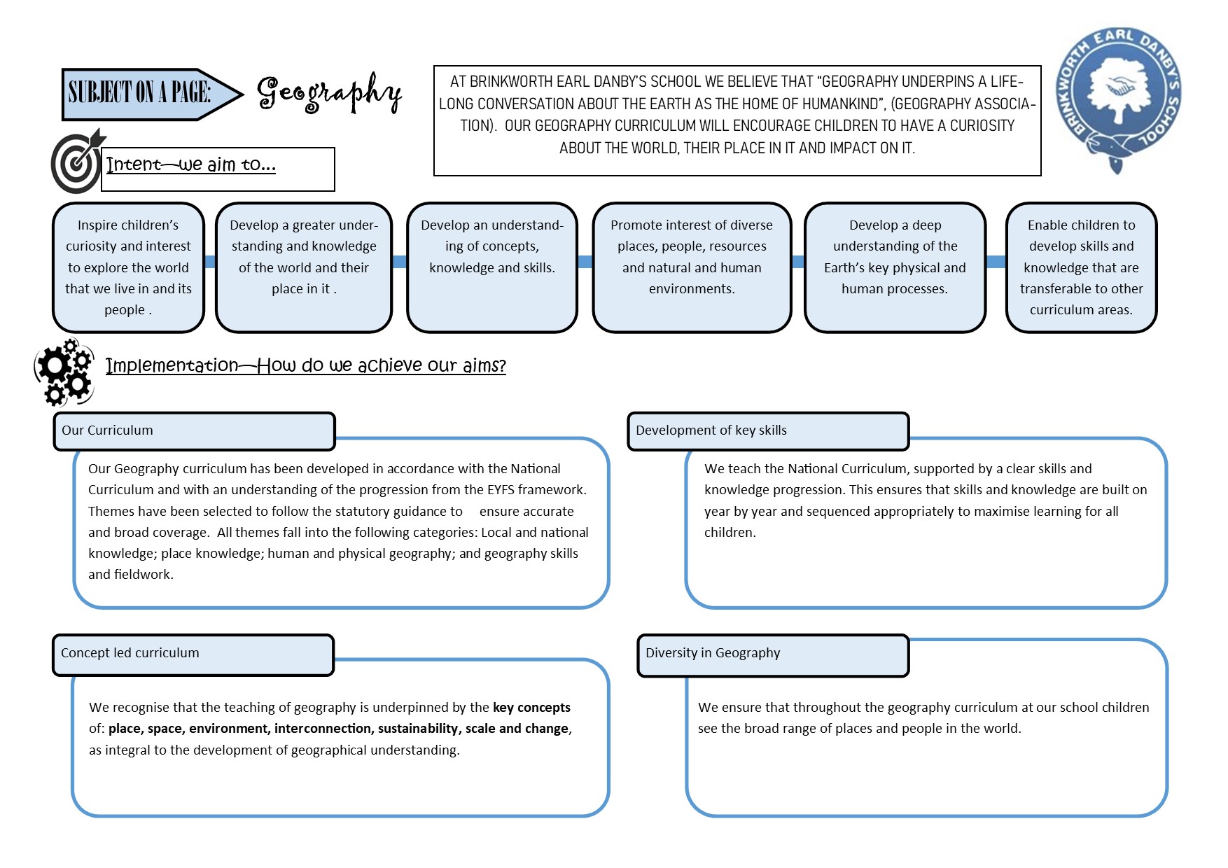 | Mission Sentence | At Brinkworth Earl Danby's School we believe that "geography underpins a lifelong conversation about the Earth as the home of humankind," (Geography Association). Our geography curriculum will encourage children to have a curiosity about the world, their place in it and impact on it. |